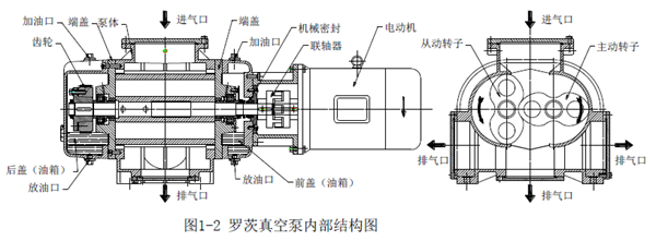 二側端蓋內的四組聚四氟乙烯活塞環密封裝置可防止兩側油箱內的潤滑油進入泵腔內,出軸處的平衡式機械密封可防止大氣漏入泵腔內。 泵的冷卻方式通常為風冷,如果泵用于高壓力范圍工作,推薦選配水冷結構的泵。 電動機的動力通過聯軸器傳給主動軸,再經過同步齒輪由主動軸驅動從動軸旋轉。LQB S系列羅茨真空泵均為臥式結構,泵采用聯軸器與電機直聯。但特殊要求的泵可采用三角帶傳動結構。