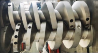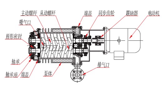 螺桿干式真空泵是通過泵腔內一對作等速反向旋轉螺桿的嚙合作用,完成從吸入氣體、壓縮氣體到排出氣體而形成高真空過程。即兩個旋向相反的非接觸螺桿型轉子在泵腔內做等速反向旋轉。當螺桿旋轉時,在螺桿真空泵的進口處吸入一定體積量的氣體,氣體被壓縮并輸送到真空泵的排出口處被排出。由于泵的二個螺桿之間以及螺桿與泵腔之間均無接觸,泵腔內不需要潤滑油。用于潤滑齒輪和軸封的潤滑油通過軸封與泵腔密封。泵的冷卻可以通過循環冷卻水直接冷卻或者通過帶有風扇及散熱器的冷卻裝置進行冷卻。