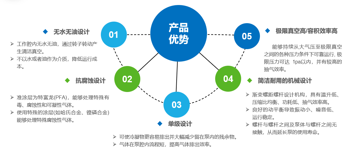 螺桿干式真空泵采用了特殊設計的螺桿轉子型線,與普通型線螺桿泵比較,降低 30% 左右的能耗,排氣端溫升降低 100℃左右,產品運行的可靠性、穩定性大大提高,可以適合任何工況的抽真空需要。